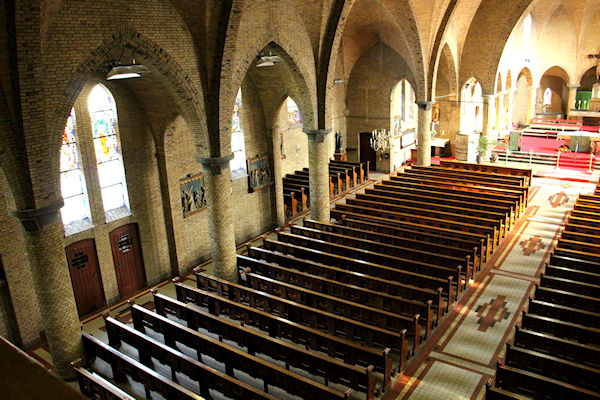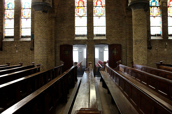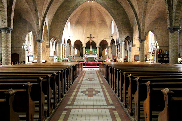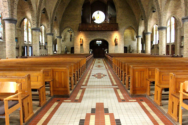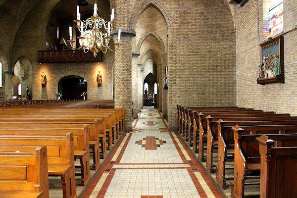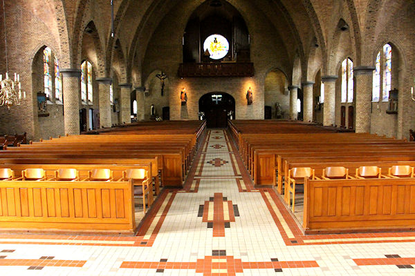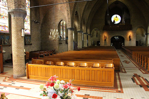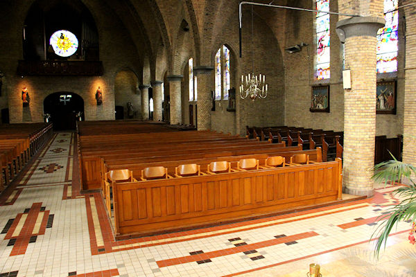 |  | Gang achter in de kerk Zicht over de kerkbanken richting het Priesterkoor. |