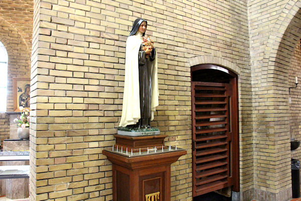 Rechts achter komt u, richting Mariakapel, langs een van de mooie beelden die onze kerk zo mooi maken. Dit is de H. Theresia.