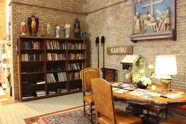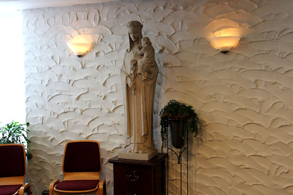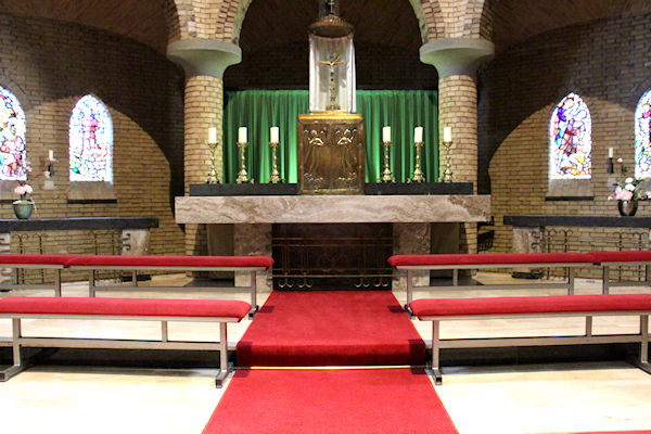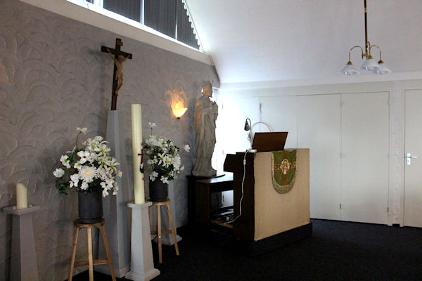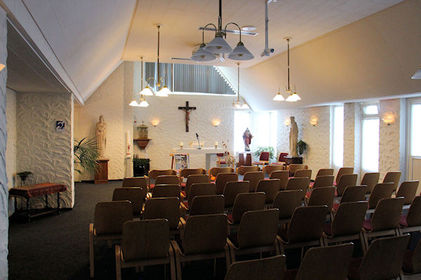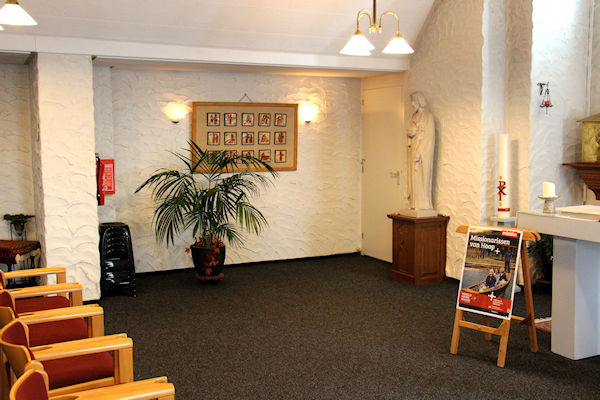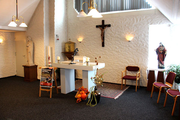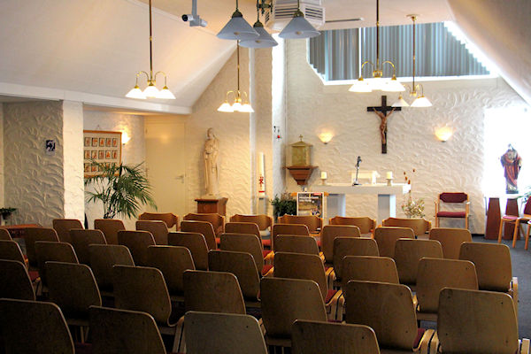 |  | Aula / kapel Voor in de kapel een kleins kruisweg.U kijkt richting het altaar |