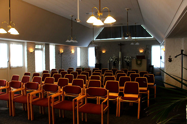 Vanaf de plaats waar het altaar staat kijkt u in de kapel. Deze kapel wordt ook gebruikt als aula. Bij het kruis wordt dan de overledene opgebaard en aan deze kant is de mogelijkheid om te condoleren.
