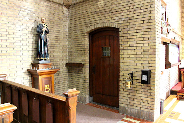 Dit is de deur naar de sacristie. Door deze deur hebben sinds de opening van de kerk veel priesters en andere voorgangers de kerk betreden.