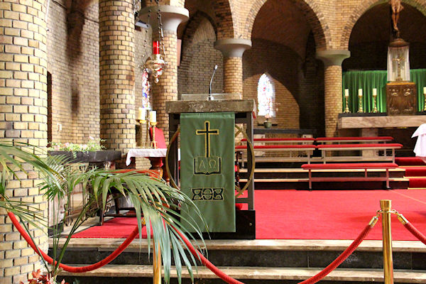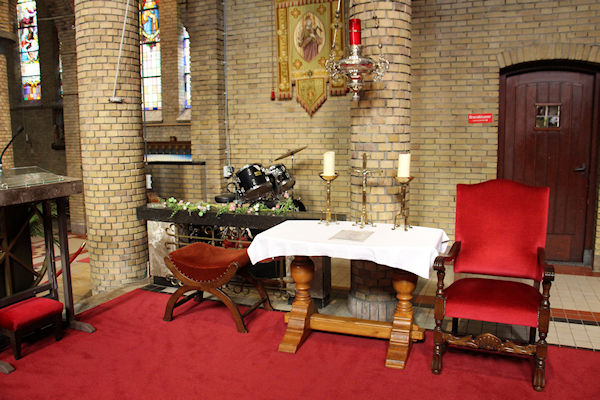 Vanaf deze plaats ziet u het altaar (altaartafel) wat gebruikt wordt tijdens de Eucharistievering en het gedeelte van de kerk waar de gelovigen zitten.