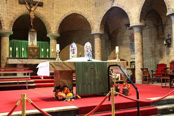 Gang voor het priesterkoor gezien vanaf het Maria altaar. De versiering op het priesterkoor heeft te maken met Oogstdankdag.