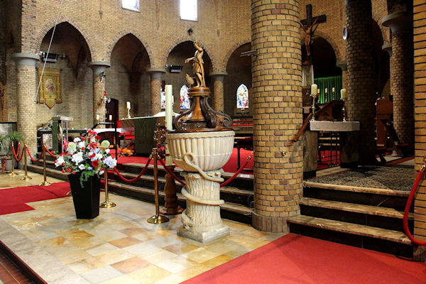 Dit is de doopvont op het priesterkoor voor in de kerk (voor het sacrament van het H. Doopsel). Hier zijn al heel veel kinderen uit de Geloofsgemeenschap gedoopt en er zullen nog velen volgen. De 7 sacramenten binnen de Katholieke Kerk zijn: