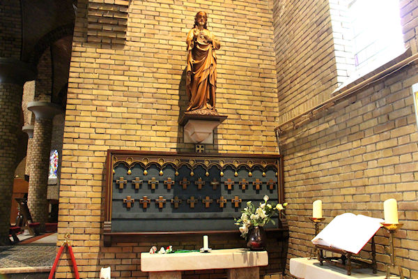 Dit is het H. Hart beeld voor in de kerk bij het bord met de kruisjes van de overledenen.