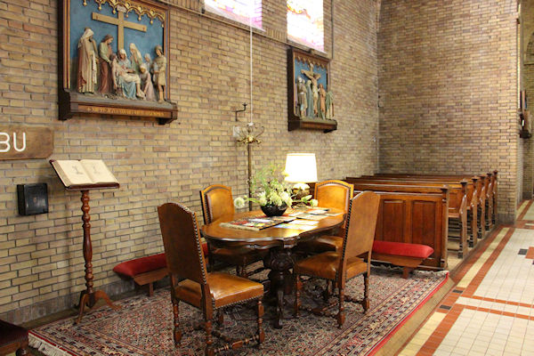 |  | Gang achter in de kerk Leestafel voor bezoekers. |