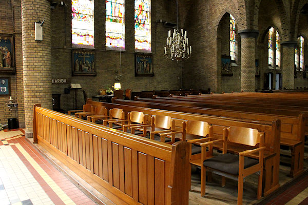 |  | Vanaf het Priesterkoor De rij banken rechts in de kerk. |