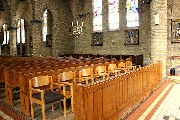 |  | Vanaf het Priesterkoor De rij banken links in de kerk. |