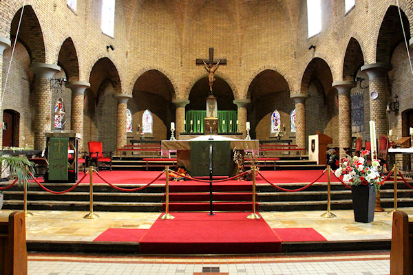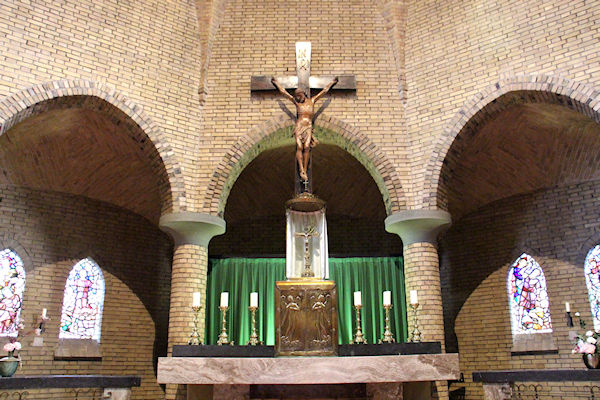 |  | Zicht op het Priesterkaar Het Priesterkoor met het altaar en het tabernakel. |
