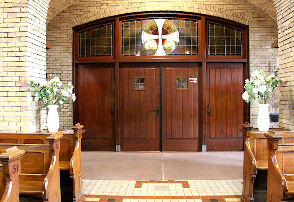 |  | Deuren naar het portaal De uitgang achter in de kerk |